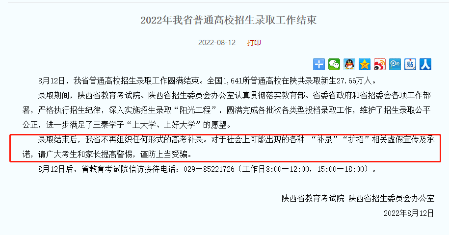 录取结束后,我省不再组织任何形式的高考补录。对于社会上可能出现的各种 “补录”“扩招”相关虚假宣传及承诺,请广大考生和家长提高警惕,谨防上当受骗。